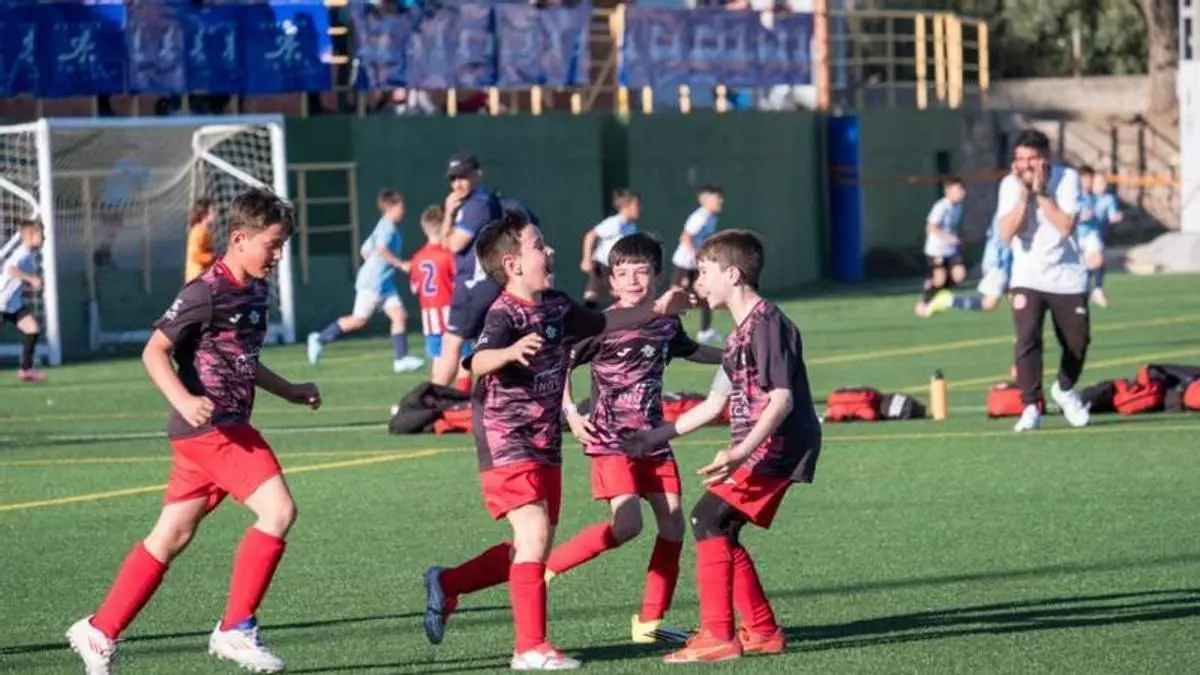 Cuatro niños celebran uno de los goles, ayer. / PRIMER TOQUE CF