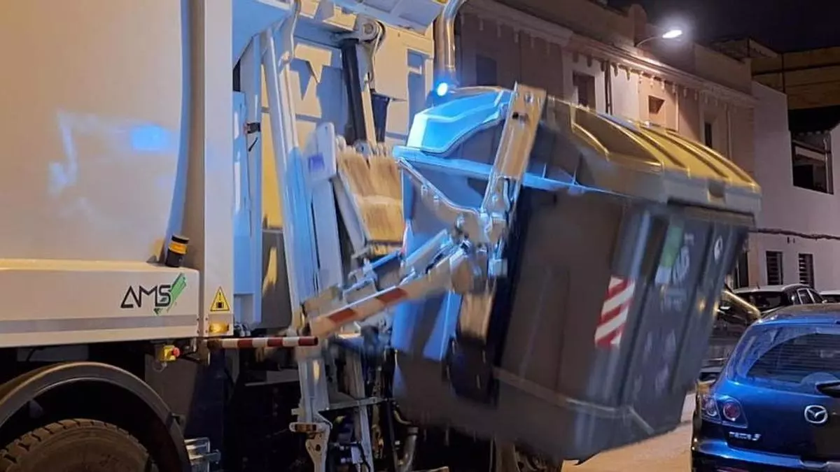 Uno de los camiones del servicio de basuras de Vila-real recoge uno de los contenedores genéricos repartidos por la ciudad. / Josep Carda